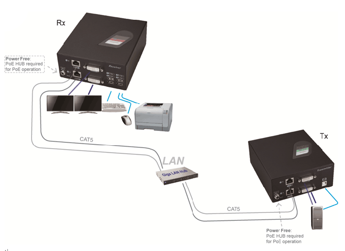 ● 通过LAN网络延长两路DVI信号,USB信号,串口信号