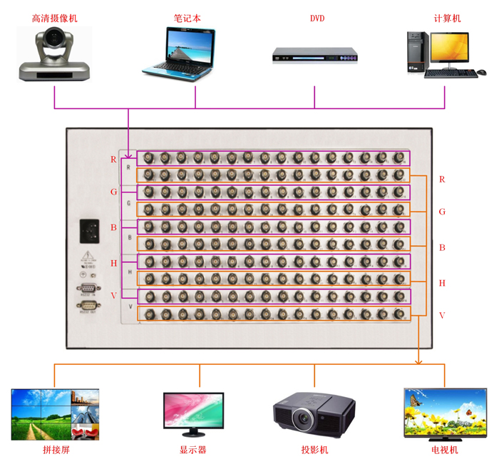 EZ-LINK RGB矩阵切换器系列可以将任意高分辨率的计算机信号切换输出到显示设备当中。它里面采用了输入输出自带缓冲设计,增强了现场抗干扰、防静电、防雷击等安全措施。RGB矩阵把VGA五种分量视频信号分别传输,这样能够减小信号在传输过程中的彼此干扰,是最终输出的图像更加的清晰稳定。并且RGB矩阵还能对信号进行一定程度的延长和补偿,所以传输的距离会变得更远一些。我们可以通过面板按钮或者遥控器对每一路信号通道进行控制,也可以多通道同时进行切换。RGB矩阵一般多用于大屏显示工程,视频会议中心,多媒体教室等。